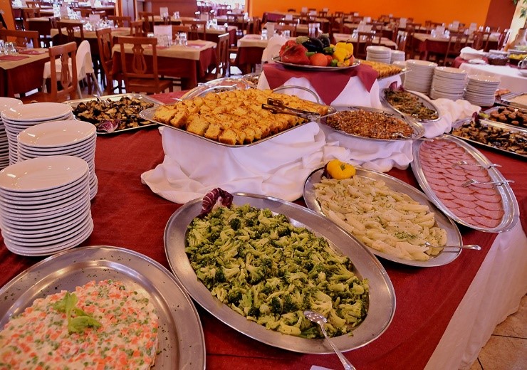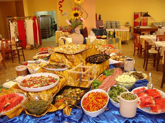 Pensione completa con prima colazione, pranzo e e cena a buffet, inclusi ai pasti acqua, vino, birra, cola, aranciata, gassosa con servizio self service dagli erogatori.